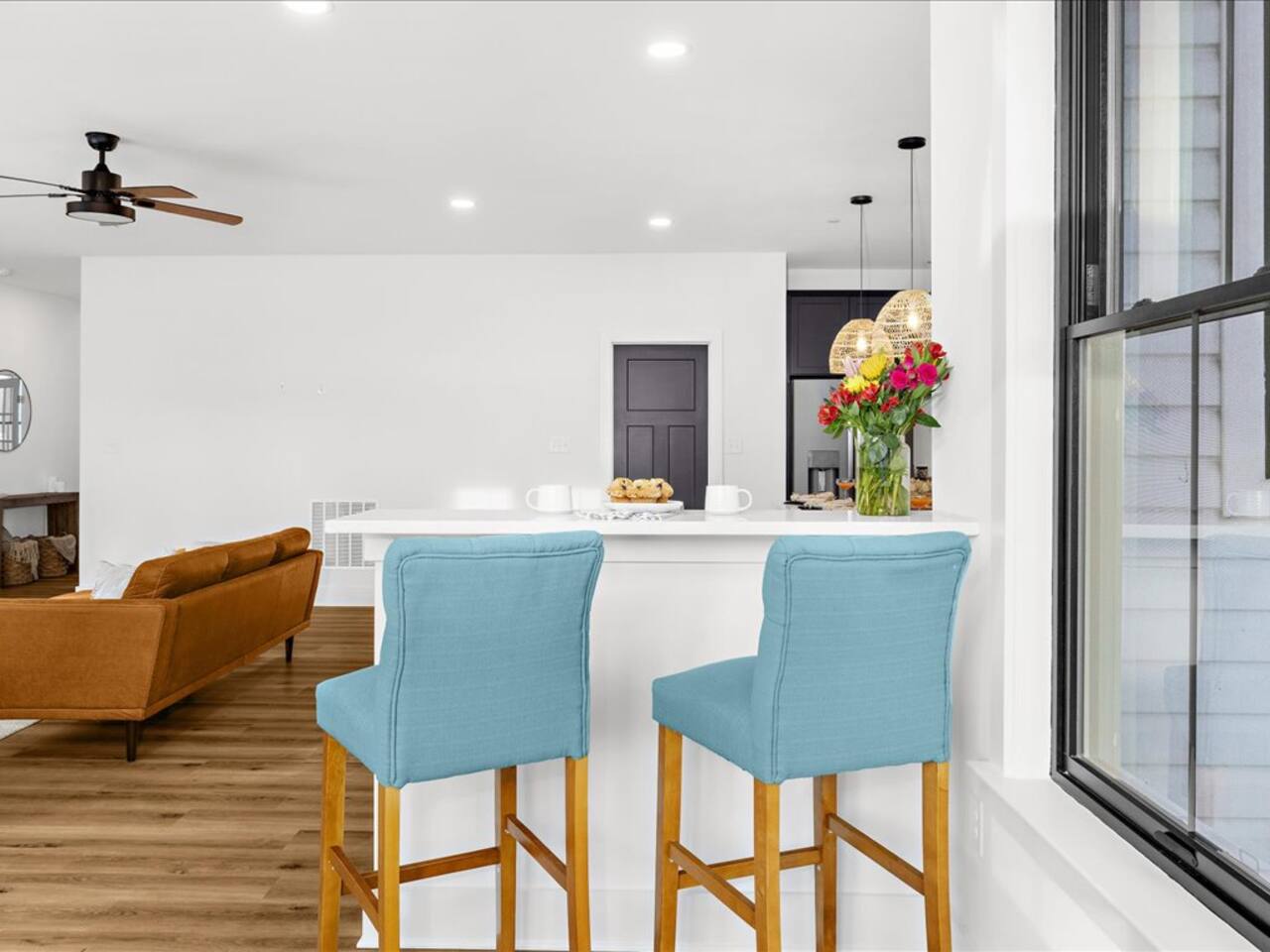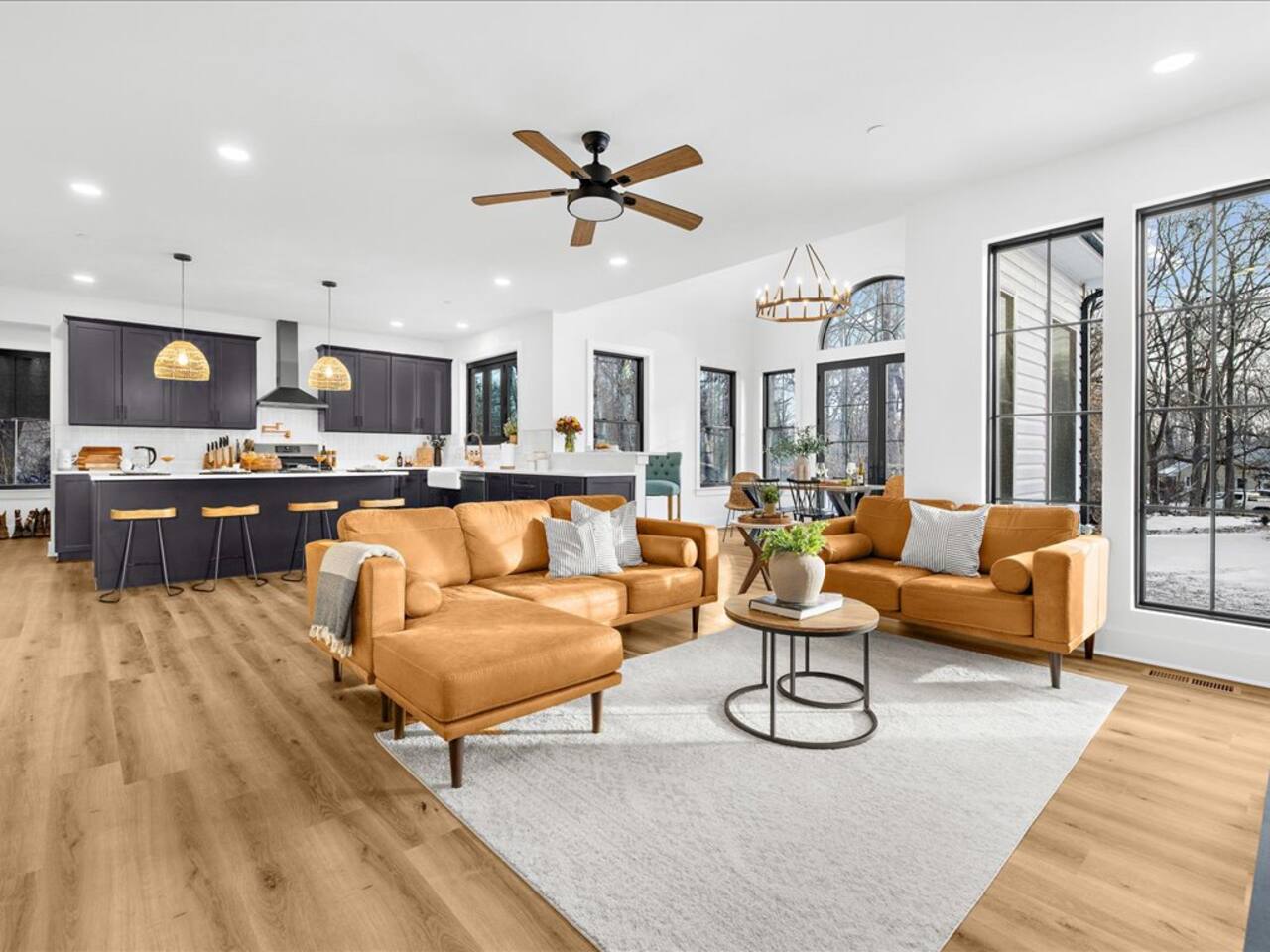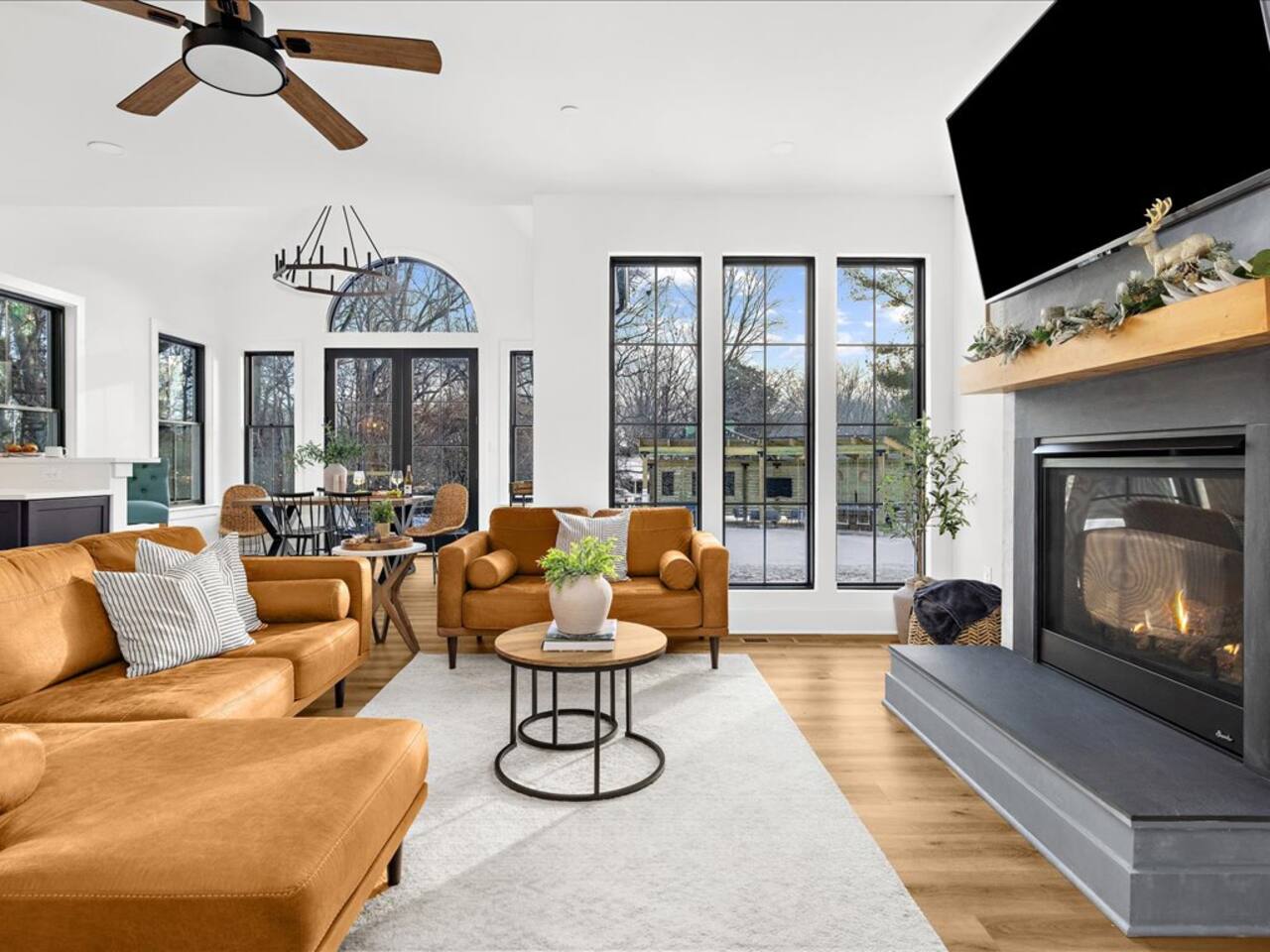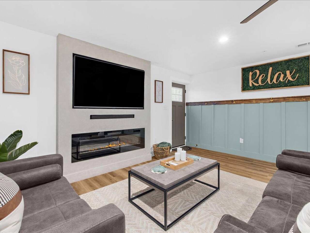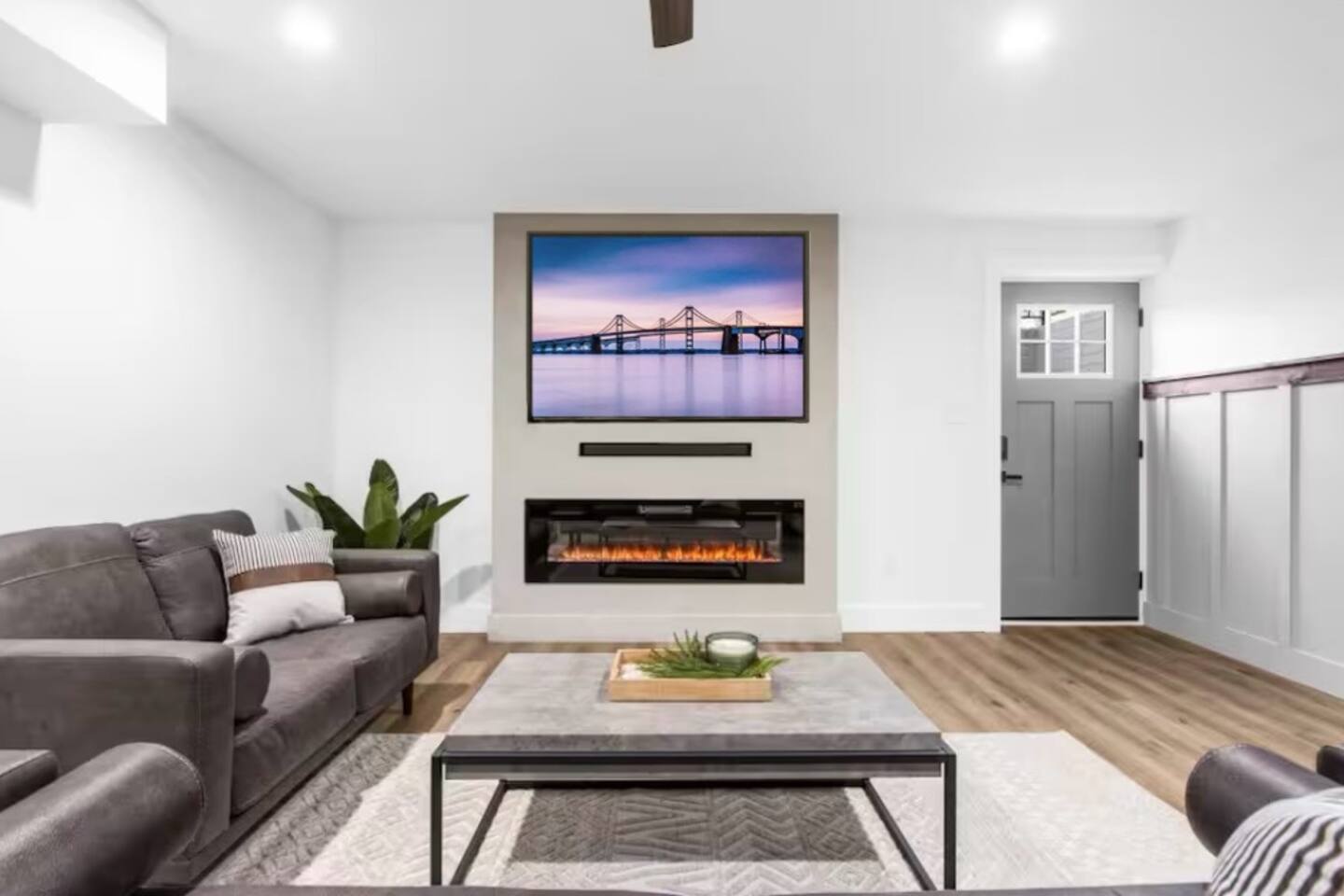 🛋️ Spacious living area with electric fireplace, 65" TV for streaming, and ceiling fan