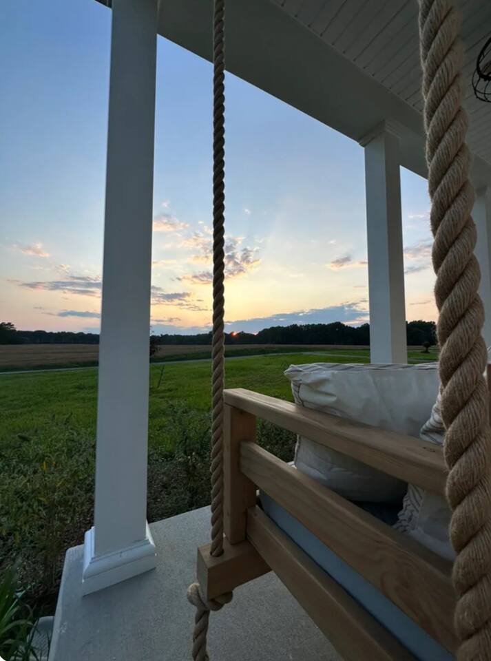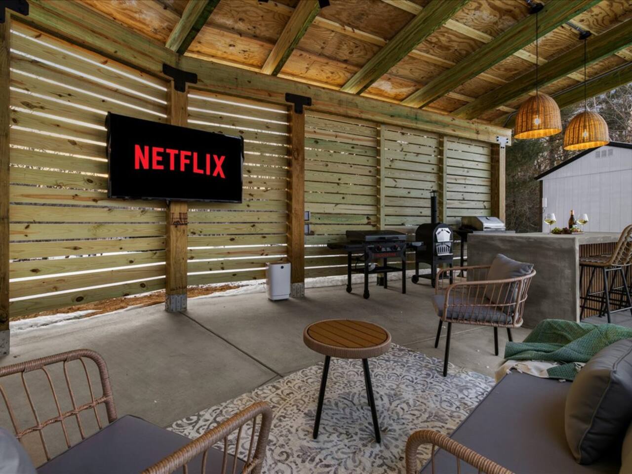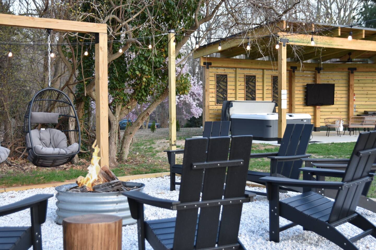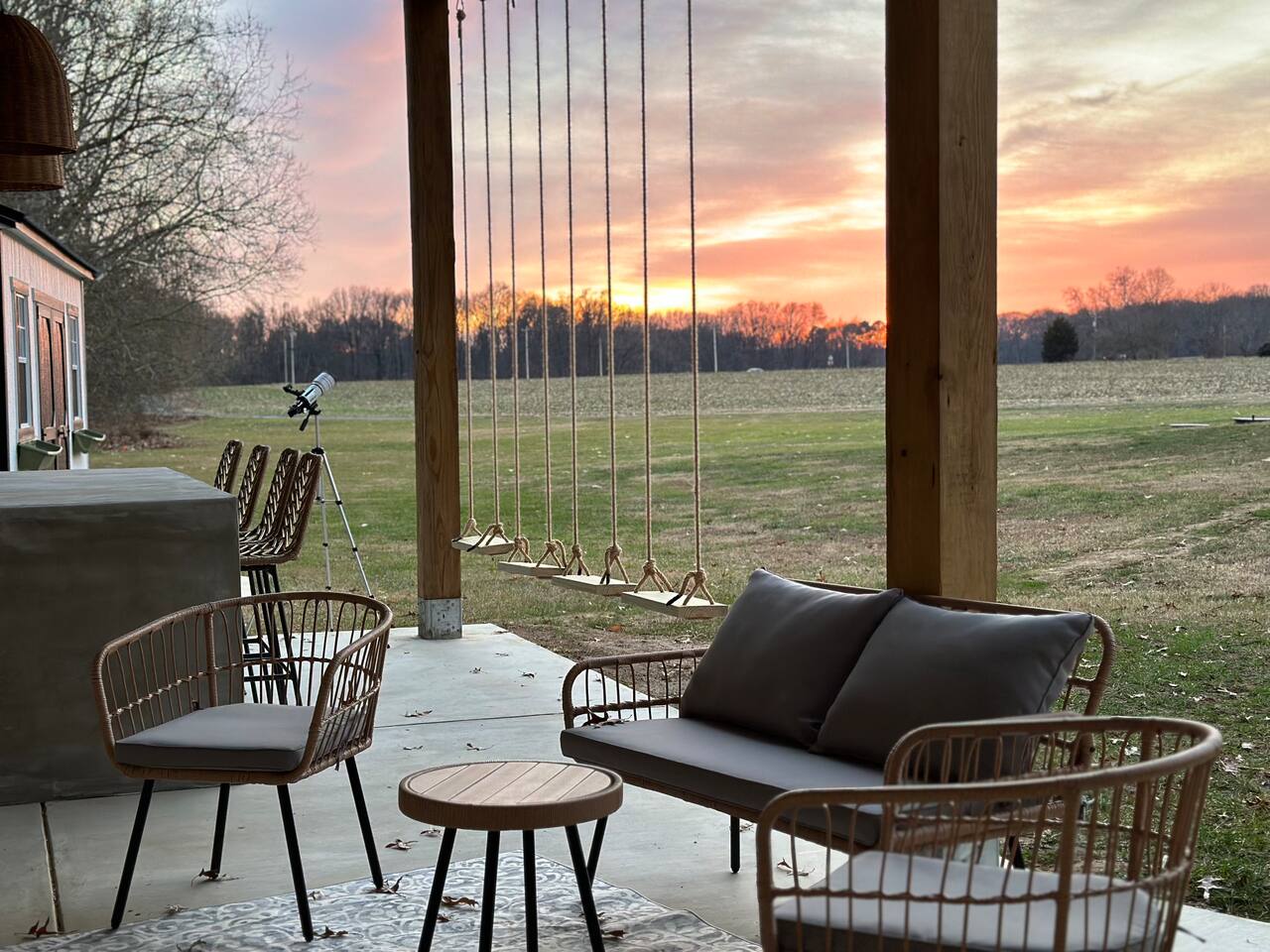 📺 Outdoor 65" TV with plenty of seating including 4 hanging swings perfect for sunset watching