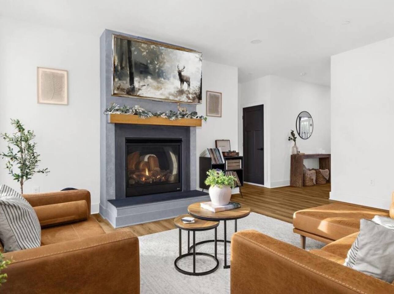 🛋️ Spacious living room with comfortable seating and a gas fireplace for warmth and ambiance