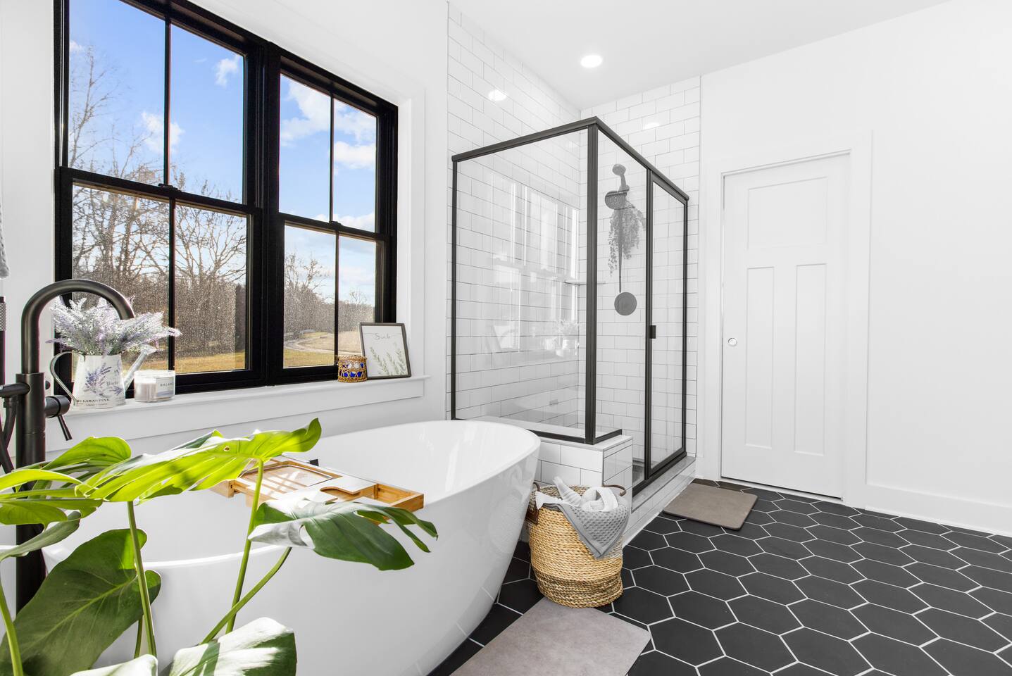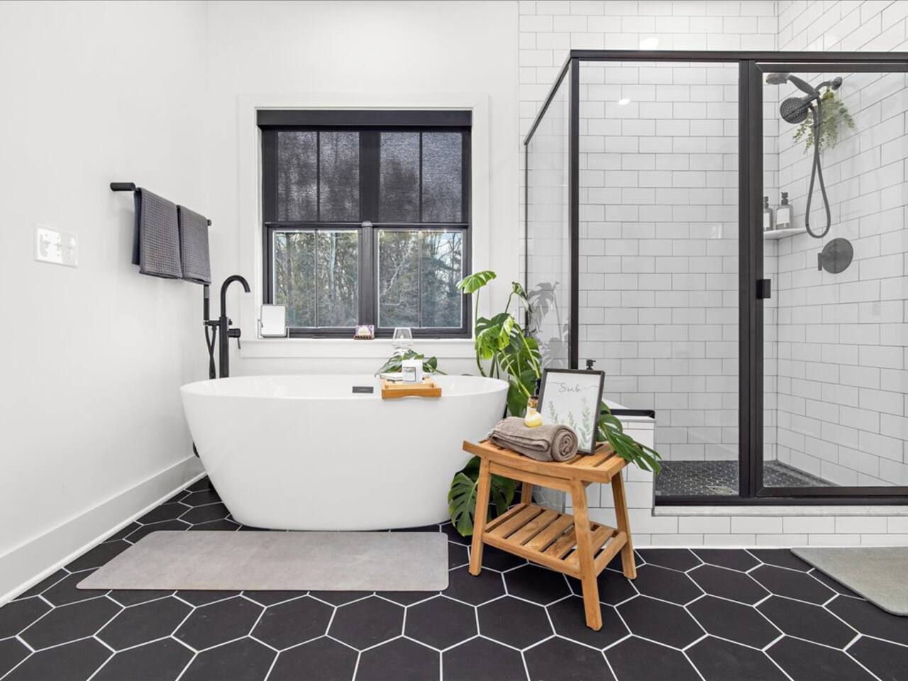 🛁 En-suite bathroom with a free-standing tub, walk-in tile shower, and double vanity