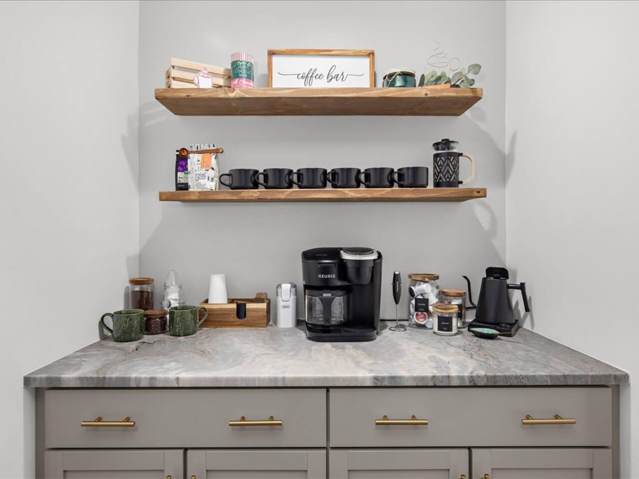 ☕ Fully stocked Coffee/Tea bar with hot chocolate, French press, and Keurig Duo for K cups or drip coffee